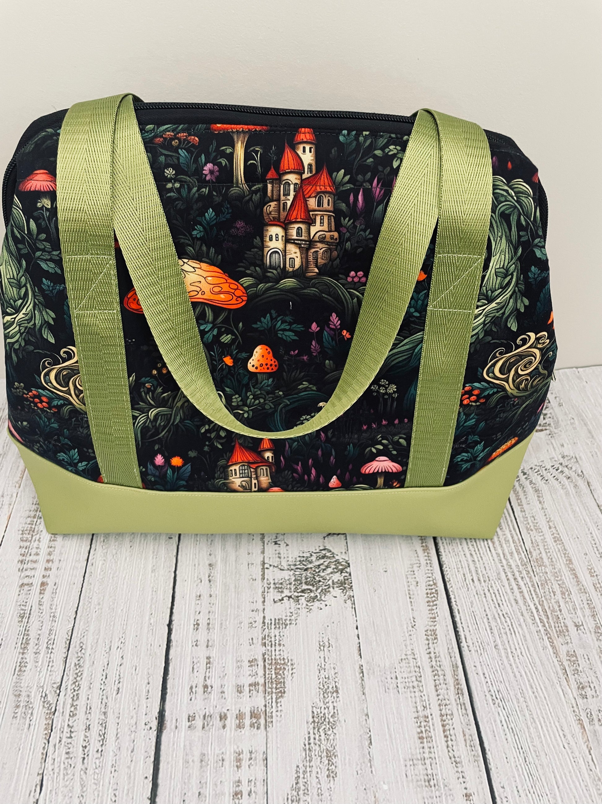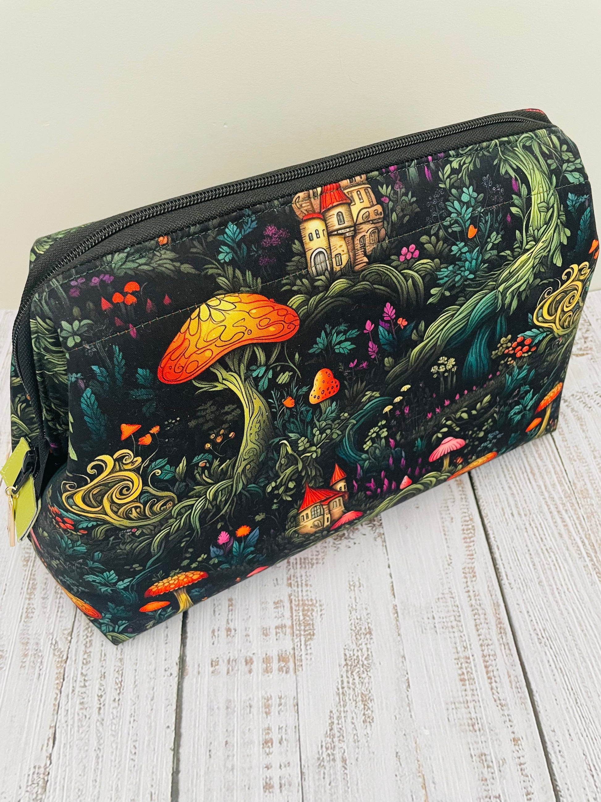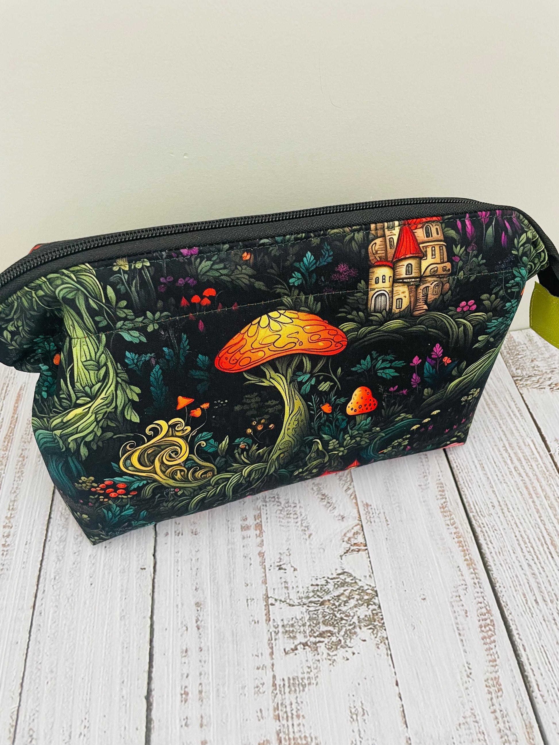 Rich with hidden details — storybook turrets tucked among curling ferns, glowing toadstools scattered across twilight foliage — this design feels like wandering through a fairy tale at dusk. Paired with vibrant chartreuse accents and luminous orange linings, each piece is both bold and beautifully unexpected.
